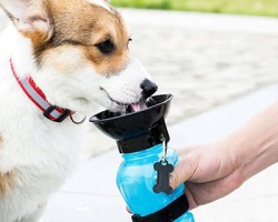 Abbeveratoio da viaggio durevole e conveniente per animali domestici. Perfetto per passeggiate e viaggi. La bottiglia è dotata di un tappo speciale a forma di ciotola, che si riempie d'acqua quando si preme la bottiglia!