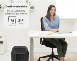 Distruggidocumenti con taglio a frammentoi 4x40 mm, livello di sicurezza DIN P4, consigliato per 1 utente, ideale per un piccolo ufficio, uso moderato. Capacità di distruzione 12 fogli da 70gsm, cestino estraibile da 19 Litri. Ciclo di lavoro 20 minuti, perfetto per distruggere volumi elevati di carta. Distrugge punti metallici, graffette e carte di credito. La tecnologia brevettata SafeSense ferma la distruzione se le mani toccano l'imboccatura della carta. Dimensioni LxPxH 34,13x24,61x46,99 cm.