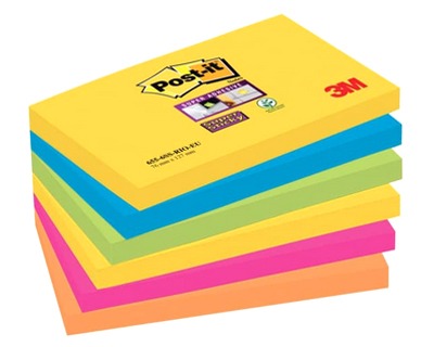 I Foglietti Post-it® Super Sticky hanno un'adesione più forte e durano di più. Hanno il doppio della forza adesiva dei foglietti Post-it® originali. Perfetti per superfici verticali e di difficile adesione, questi ampi foglietti adesivi sono perfetti per appuntarsi un numero di telefono o un codice. Ispirati ai colori di Rio de Janeiro (giallo Canary™, fucsia, mediterrean blue, verde neon, arancio neon) sono super resistenti e super versatili e realizzati per mettere in risalto i tuoi messaggi.