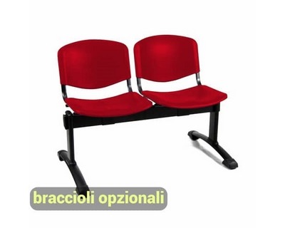 Panca a 2 posti collettività-attesa Dado D5P2P, struttura in acciaio nero, Braccioli opzionali (codici 110073, 110078), a schienale fisso. Sedute realizzate in PPL rosso. Dado è una linea veramente multipurpose, che presenta ogni soluzione per i più svariati utilizzi